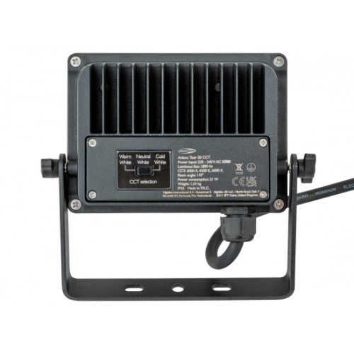 Der Aviano Tour 20W CCT von Showtec ist ein Fluter mit 48 x 0,4-W-LEDs, die insgesamt 1800 Lumen erzeugen. Du kannst die Farbtemperatur ganz einfach über einen ergonomischen Drehknopf auf der Rückseite auswählen. Warm-, Neutral- und Tageslichtweiß (3000 K, 4200 K oder 6000 K). Mit seinem Gehäuse aus Aluminiumguss und der IP-Schutzart 65 ist er bestens für Outdoor-Bedingungen gewappnet. Über den zusätzlichen Anschluss am Netzkabel kannst du ganz einfach mehrere Scheinwerfer miteinander verbinden. Im Lieferumfang ist auch eine stabile Halterung enthalten, mit der du den Fluter sicher befestigen kannst.