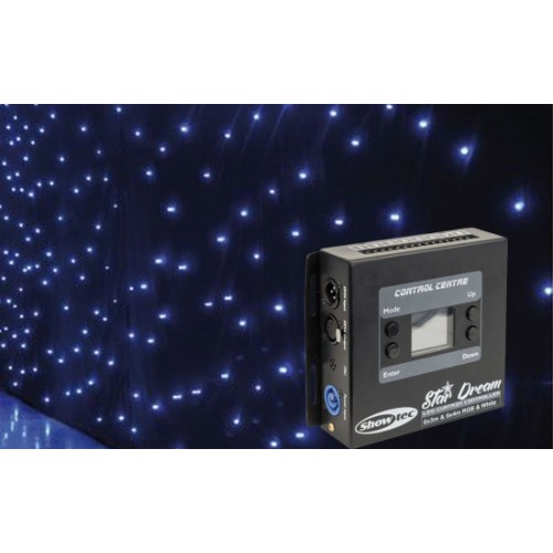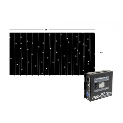 Der Showtec Star Dream ist 6x3 m groß und kann problemlos mit dem Wentex Pipe & Drape-System verwendet werden. Der Bühnenvorhang ist mit Klettverschluss und Ösen ausgestattet. Die 144 weißen LEDs sind in 8 Gruppen mit eigenem integrierten Controller unterteilt. Der Star Dream verfügt über unterschiedliche Betriebsmodi wie Auto, Musiktaktung und Master/Slave. Durch den 3-poligen XLR-Ein- & Ausgang ist die Ansteuerung über DMX auch kein Thema. Der Star Dream besteht aus flammfestem, schwarzem Molton.