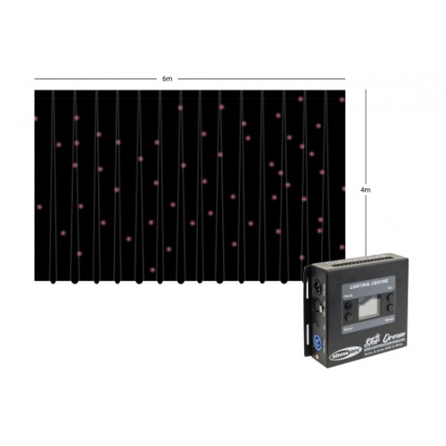 Der Showtec Star Dream ist 6x4 m groß und kann problemlos mit dem Wentex Pipe & Drape-System verwendet werden. Der Bühnenvorhang ist mit Klettverschluss und Ösen ausgestattet. Die 128 RGB-LEDs sind in 8 Gruppen mit eigenem integrierten Controller unterteilt. Der Star Dream verfügt über unterschiedliche Betriebsmodi wie Auto, Musiktaktung und Master/Slave. Durch den 3-poligen XLR-Ein- & Ausgang ist die Ansteuerung über DMX auch kein Thema. Der Star Dream besteht aus flammfestem, schwarzem Molton.