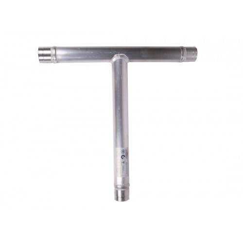 Sweettruss KV1/050-T36H 1-Punkt T-Stück, gefertigt aus 50 x 2 mm Tragrohr. Das 1-Punkt Aluminium-T-Stück findet aufgrund seiner leichten und optisch ansprechenden Bauweise Verwendung auf kleinen Bühnen, sowie im Werbe- und Architekturbereich. Das T-Stück wird über konische Verbindungselemente und Kegelstifte mit den Traversen verbunden.