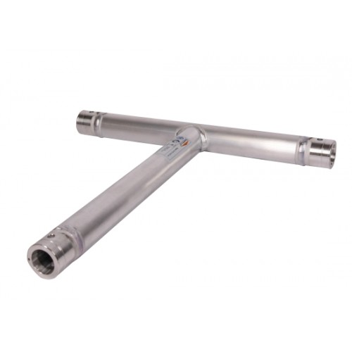Sweettruss KV1/050-T36V 1-Punkt T-Stück, gefertigt aus 50 x 2 mm Tragrohr. Das 1-Punkt Aluminium-T-Stück findet aufgrund seiner leichten und optisch ansprechenden Bauweise Verwendung auf kleinen Bühnen, sowie im Werbe- und Architekturbereich. Das T-Stück wird über konische Verbindungselemente und Kegelstifte mit den Traversen verbunden.