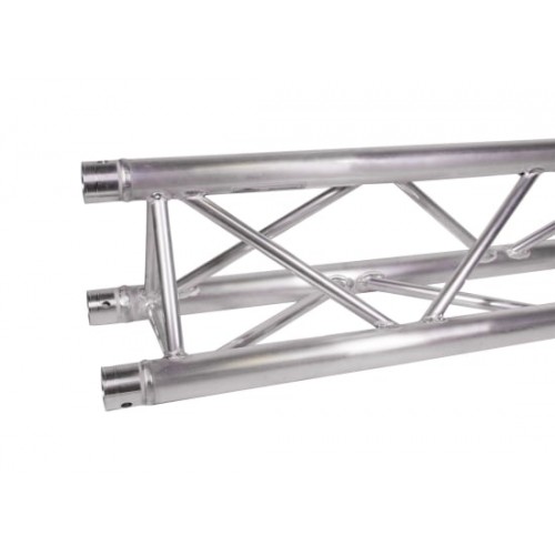 Die 3-Punkt Aluminiumtraverse findet aufgrund ihrer leichten und optisch ansprechenden Bauweise Verwendung auf kleinen Bühnen, sowie im Werbe- und Architekturbereich. Die Traversen werden über konische Verbindungselemente mit Kegelstiften untereinander verbunden.