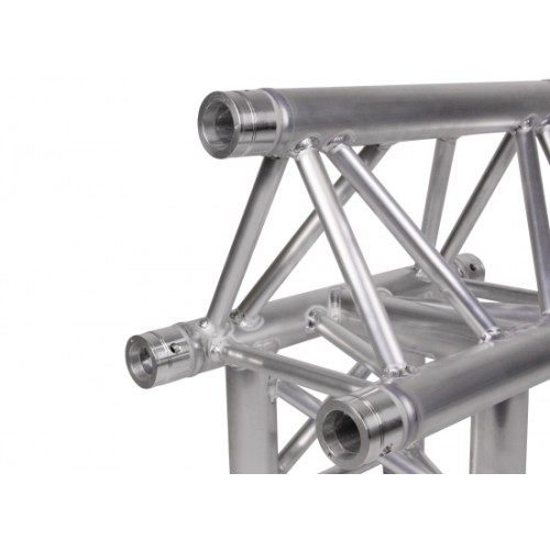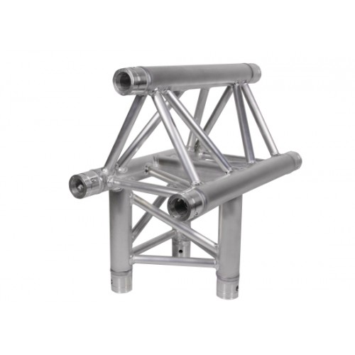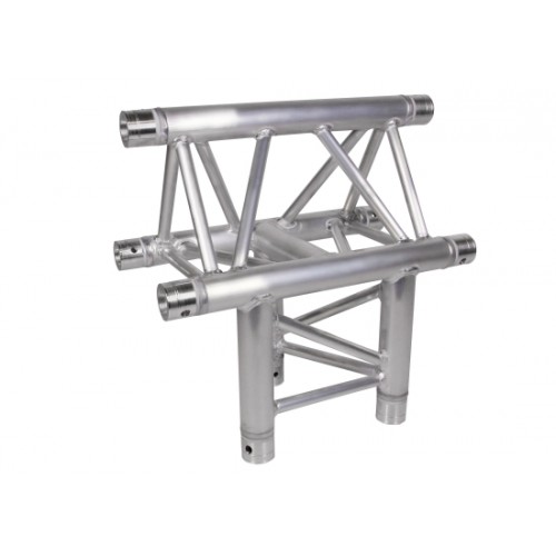 Das 3-Punkt Aluminium-T-Stück findet aufgrund seiner leichten und optisch ansprechenden Bauweise Verwendung auf kleinen Bühnen, sowie im Werbe- und Architekturbereich. Das T-Stück wird über konische Verbindungselemente und Kegelstifte mit den Traversen verbunden.