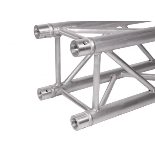 Die 4-Punkt Aluminiumtraverse findet aufgrund ihrer leichten und optisch ansprechenden Bauweise Verwendung auf kleinen Bühnen, sowie im Werbe- und Architekturbereich. Die Traversen werden über konische Verbindungselemente mit Kegelstiften untereinander verbunden.
