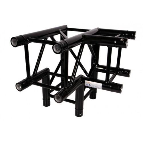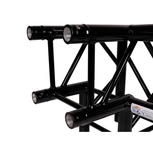 Das 4-Punkt Aluminium-Eckstück findet aufgrund seiner leichten und optisch ansprechenden Bauweise Verwendung auf kleinen Bühnen, sowie im Werbe- und Architekturbereich. Die Eckstücke werden über konische Verbindungselemente und Kegelstifte mit den Traversen verbunden.