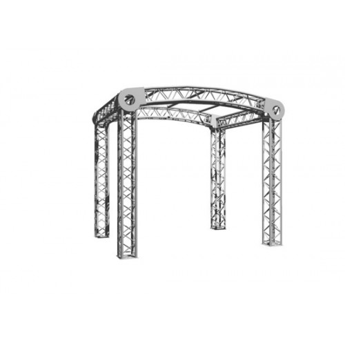 Die variable Größe des Sweettruss RD 3020 Varia Rundbogendach kann durch den unterschiedlichen Aufbau von Kreissegmenten und Vier-Punkt-Traversen bestimmt werden. Grundständig werden vier Bodenplatten mit integrierten Halbkonusverbindungen verbaut. Darauf aufbauend werden für die senkrechte Stabilität des Rundbogendaches vier Vier-Punkt-Traversen mit einer Größe von 2,5m benötigt.