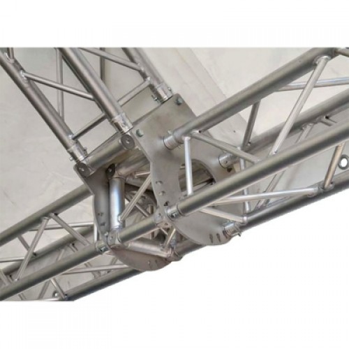 Alle Traversenteile des Sweettruss RD 6040 Varia Rundbogendaches werden inklusive der Konusverbindungen oder der Halbkonusverbindungen geliefert. Der Varia Corner setzt sich aus zwei Aluplatten, einem Kopfrahmen und vier Halbkonusverbindungen mit Bolzen und Splints zusammen. Die Bolzen und Splints sind beim Cornerblock ebenso inklusive.