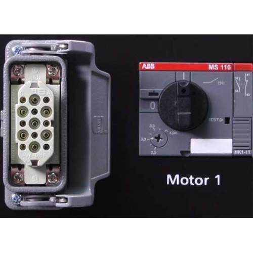 - Motorschutzschalter mit Drehschalter pro Kanal. Auslösestrom einstellbar