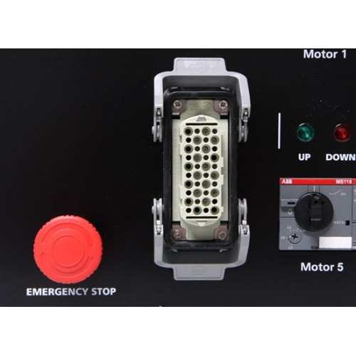 Von der Handsteuerung wird ein Signal (Up/Down) an den Controller gesendet, der über die Splitbox die Motorkettenzüge steuert.