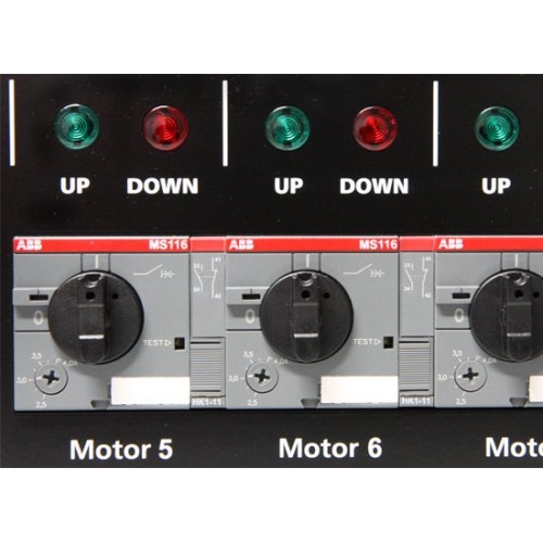 - Motorschutzschalter mit Drehschalter pro Kanal. Auslösestrom einstellbar