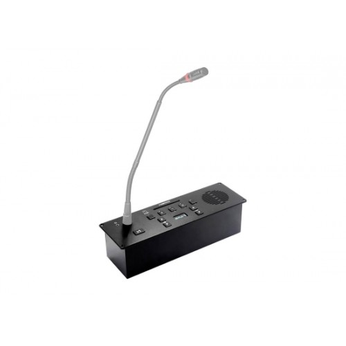 Die CLEACON-D Einbau-Sprechstellen können aufgrund ihrer Bauweise im Konferenztisch so weit versenkt werden, dass nur noch das Bedienelement sichtbar ist und ca. 5 mm über der Oberfläche herausragt. In diesen Sprechstellen sind alle Funktionen, wie Sprachwahl und Abstimmung integriert.